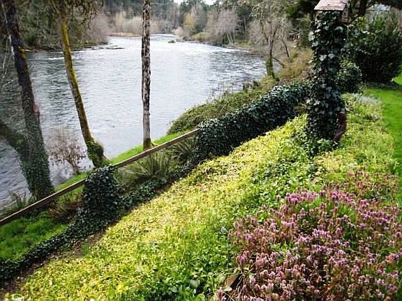 Absorb year round beauty on this sought after river frontage, picturesque views,multi covered,open and screened in decks,walking paths,native gardens,paved driveway,RV turnaround,RV garage and enclosure,shop and wood shed.Master suite with endless views, living rm/wood burning fireplace,formal dining room,office area and walls of windows,sits up above the flood plain is fenced and gated