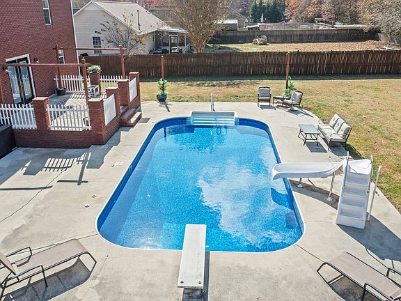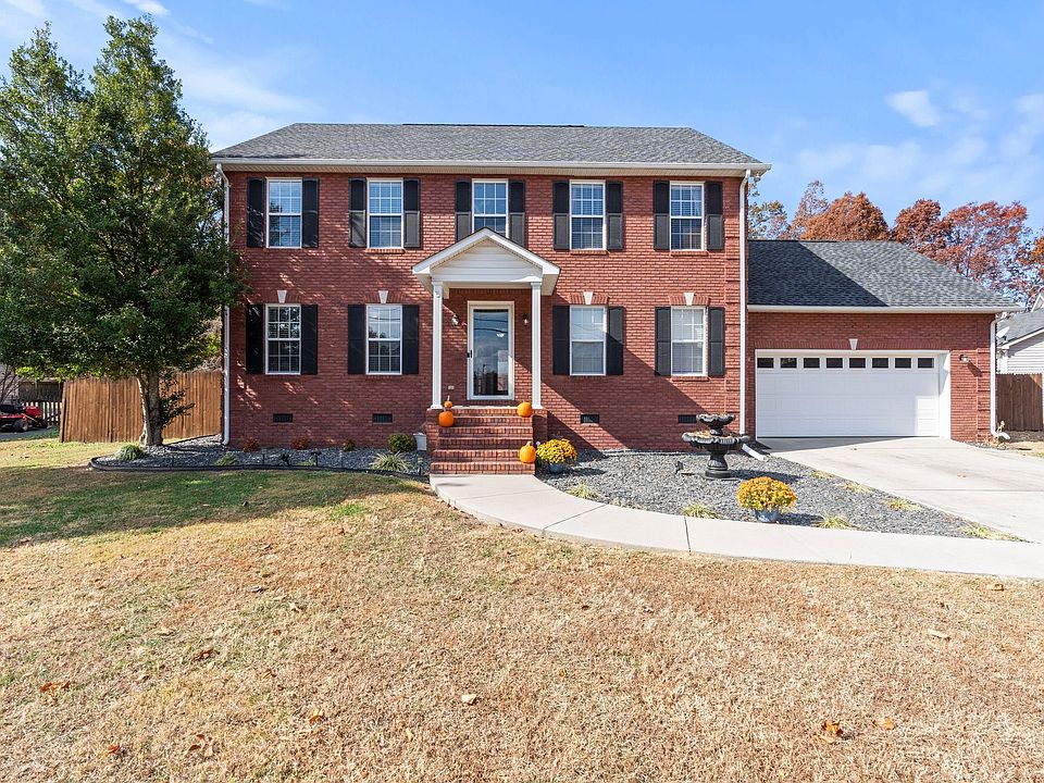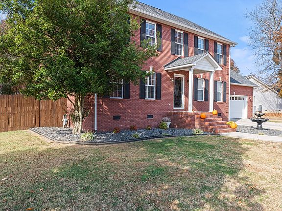 Stately all brick two story home featuring up to 5 bedrooms 2.5 bathrooms, primary bedroom downstairs, granite counter tops in the kitchen, lots of storage, two car garage, raised courtyard, in-ground pool w/slide and diving board, and fenced backyard that backs up to woods.