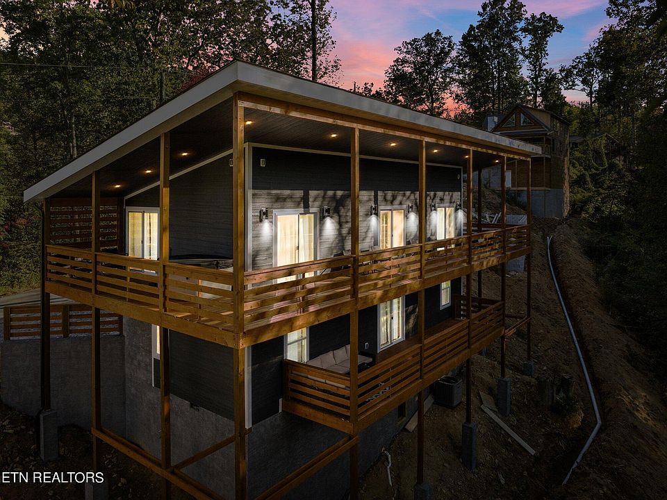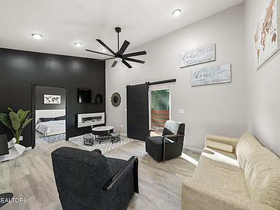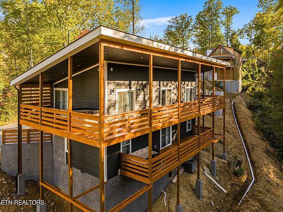 5 bedroom Gatlinburg Tennessee, Fully furnished. Its about 5 mins from all of the attractions in Gatlinburg, and just a few mins from the Great Smoky Mountain National Park. When walking in the open living room area that boasts great lighting from the windows. LVP flooring throughout and granite countertops in the kitchen. The open space for gathering with a large TV and fireplace. The modern style furniture is top notch. Each room is beautifully decorated with fireplaces in each queen bedroom. Three of the bedrooms on the main floor. Once you step downstairs there is a nice sitting area to hang out watch tv with a fireplace. There is a pool table/ping pong table. Basketball arcade game and a basketball shooting game. The barn doors are an extra addition that really compliments the house. Also the decks on both levels are so spacious with great sitting area to enjoy the views and the hot tub on the side for privacy. Check it out today!!!