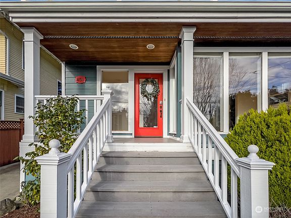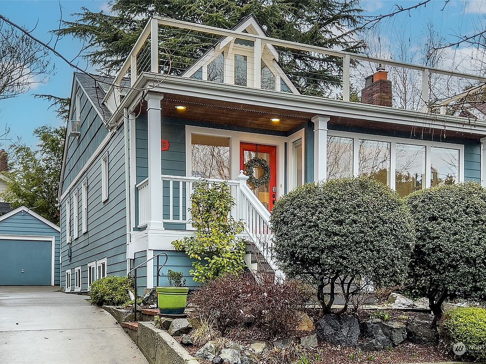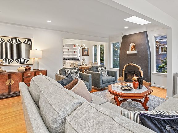 Nestled on a quiet street in the heart of Fremont, this south-facing 4-bedroom home features an open living area w/coved ceilings + natural light. A charming fireplace serves as the centerpiece, separating the living and dining areas. The functional kitchen w/gas stove offers ample prep space and optimal storage. Two bedrooms + full bath complete the main level. The 2nd floor private primary suite is complete with a rooftop deck offering sweeping views of the city skyline and, on clear days, Mt Rainier. The lower level is a versatile living space, featuring a full kitchen, spacious living room, bedroom + updated bath. Beautiful low-maintenance backyard, w/a large patio surrounded by nature + greenhouse. Quick to local shops + dining.
