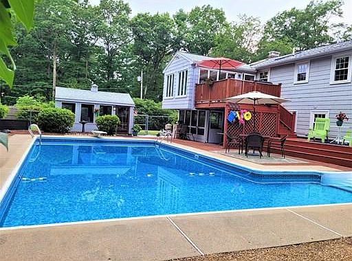 Look no further, this is the perfect location for your STAYCATION! Spend the lazy summer days floating around in the fabulous inground pool. You can enjoy watching the kids swim from the patio or one of the TWO screened rooms. This fenced, corner lot is truly your backyard oasis! Meticulously cared for and maintained, this homes updates include a newer on demand gas heating system and hot water. Roof is seven years young. Mass Save insulation. On the main level you'll find the kitchen with a vaulted ceiling and skylights that bring in beautiful natural light, windows galore in the family room overlooking the pool, hardwood flooring in the living room and 3 bedrooms, and a generous size full bath. Downstairs is a room could be used as 4th bedroom or the coveted office, fireplaced family room, bathroom with shower, and laundry.. Walk out to one of the screened rooms just steps away from an outside shower! Nothing to do but move in!