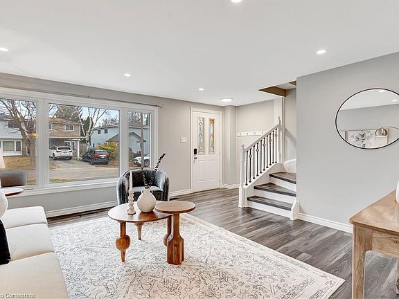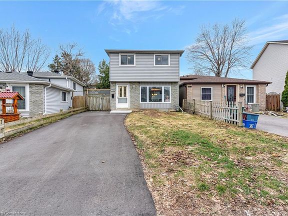 This charming and affordable detached home is the perfect opportunity to get into the market without compromising on space or style. With 3 bedrooms, 2 bathrooms, parking for 3 vehicles AND a fully fenced backyard, it offers everything a first-time buyer or growing family could need. Step inside and be impressed by the fully renovated main and second floor- featuring neutral, modern finishes that create a bright and welcoming atmosphere. The open-concept living room leads into the kitchen and dining area. The stylish white kitchen features shaker-style cabinets, a low profile microwave, subway tile backsplash, and all appliances including a dishwasher. The dining area offers a walkout to the deck and fully fenced backyard—perfect for summer BBQs and entertaining. Not to mention-the side entrance offers excellent potential for an in-law suite or separate living space, and the finished basement adds even more flexibility with a wet bar, a great rec room space, and laundry. Updates include a new asphalt driveway (Fall of 2024- with parking for three vehicles), freshly renovated kitchen, bathroom, flooring, staircase, trim & paint. Whether you’re a first-time buyer, investor, or just looking for a low-maintenance lifestyle in a Cambridge detached home with nothing to do but unpack and move in—this home is a true gem!