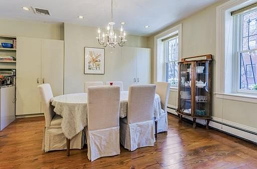 Gracious 1840s Greek Revival single family w/ significant original details including curved staircase, wide planked pine floors & floor to ceiling windows. Convenient short front stoop entryway leads to welcoming foyer. Center-island eat-in chef's kitchen w/ granite counters is flooded by light through glass wall framing square south facing bricked garden. One level up sweeping stair to signature high ceilinged true double parlor w/ pocket doors & two black Portofino marble fireplaces. Half bath & separate office also on this floor. Next level up has front facing master suite w/ generous walk in closet, ample second bedroom & full bathroom. Three bedrooms on top floor w/ soaring ceilings serviced by additional bathroom. Numerous infrastructure improvements, full basement for significant storage & a garage parking space in immediately adjacent health center garage add to this enticing offering. This beautiful home is steps from Blackstone Square, restaurants & everything the South End.