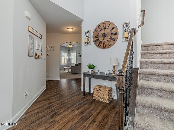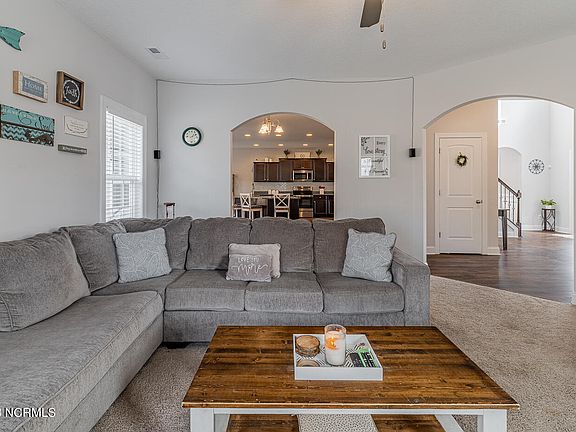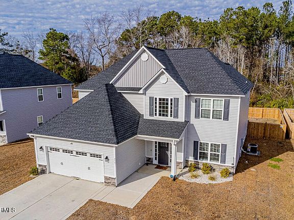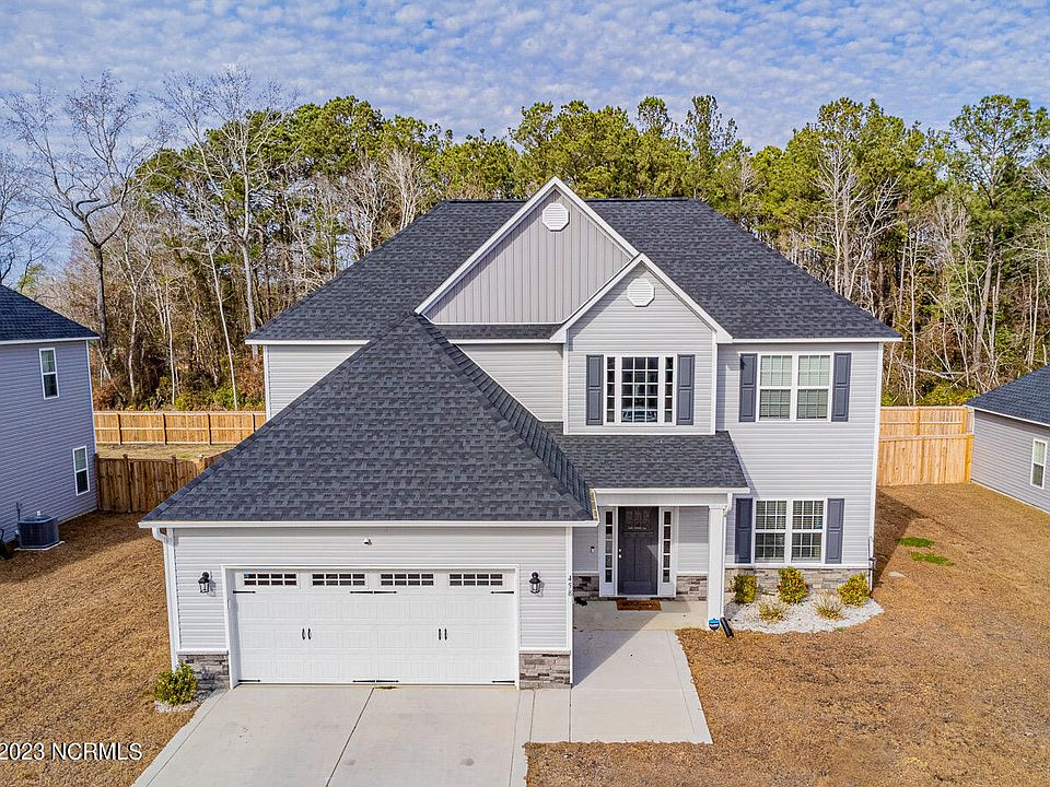 This stunning 4 bedroom, 2.5 bathroom home built in 2021 at Stateside is ready for you to call HOME. The gracious two story foyer welcomes you to the main living area and you'll enjoy the easy flow to the beautiful Kitchen with a spacious center island to the keeping room & Formal Dining Room. All 4 bedrooms are located on the second. The Primary Suite is complimented with trey ceiling and an ensuite bathroom with dual vanity, separate shower and soaking tub and leads to a spacious walk in closet. All three Secondary Bedrooms are spacious with terrific closet space. The fully fenced back yard is the perfect spot to kick back under the covered patio. Stateside Subdivision is conveniently located just minutes from local restaurants, shopping, schools, beaches and Camp Lejeune.