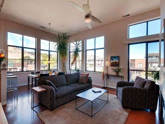 Truly unique at Uptown Broadway! This hip one-story, end unit features grand 12'ceilings, expansive windows w/great light, Foothills views & its own private, secured entrance. One bedroom plus 1.5 baths with awesome finishes including bamboo floors, granite slab counters, stainless appliances, upgraded fixtures, remodeled vanity bathroom, ceiling fans, slate tile work, gas fireplace & designer paint. Just steps from bus line, numerous restaurants, hiking trails & retail. 12" concrete slab below + privacy wall makes for very quiet space. One car garage & balcony.