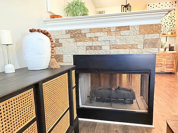 Granite islandStone fireplaceFresh paint throughoutCovered patio pergolaNew stainless steel sinkCozy fenced patioPlenty of natural light