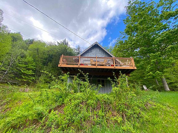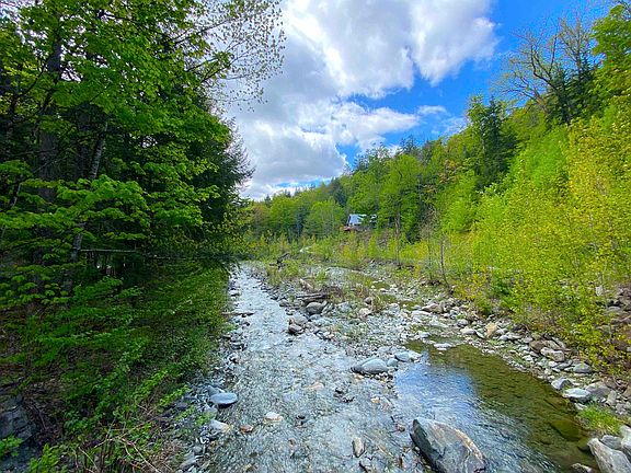 This serene one bedroom one bath A Frame located on 4.2 acres river frontage and views on Lilliesville brook. House is very quiet, secluded and tranquil and is ready for light renovation or simple full time residence. Enjoy the red brick fireplace stretching the height of two stories in the living room with a wood burning stove and galley style kitchen. Upstairs the bedroom is simple with an additional porch which also has river views. The bath is located downstairs along with the utilities which also includes a multi purpose living room and recreation space that walks out to yard space. Walk outside to the porch and hear the tranquility rush of the Lilliesville Brook as the property sits perched above. The land is mixed flat and hill side with the majority of the propery being wooded. Property is accessed by a shared bridge spanning the River. Get your quite slice of Vermont Today and book a showing!