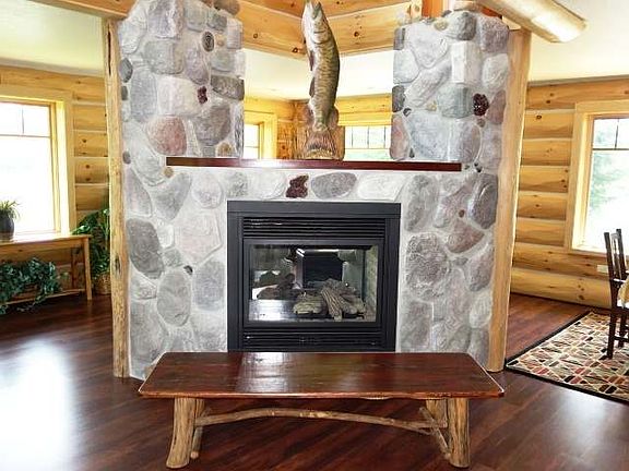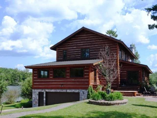 950' of peninsula shoreline on French Lake is the site of this impressive custom 4BR/5BA home. The master suite is massive w/275 sq ft featuring a 4 season room, over 200 sq ft of walk-in closets & 190 sq ft bath w/fully tiled double shower & 2 person whirlpool tub. The open concept kitchen w/quartz counters, custom cabinetry, stainless commercial grade built-in appliances & island w/prep sink, cooktop & breakfast bar is a chefs dream. Dining area, corner sitting area & LR have vaulted ceilings, wood floors, lake view windows, duel paddle fan & fieldstone see-thru gas fireplace. Take the log staircase to the upper lever to find a loft sitting are overlooking the living room w/lake views, 2 large bedrooms, full bath, & guest suite w/bath & his/hers closets. This home was built on the site of the "last resort" & the lower level holds the original bar along with a game room, bath, a huge exercise room & 2+ car garage. This property also features, boat launch & guest cottage.
