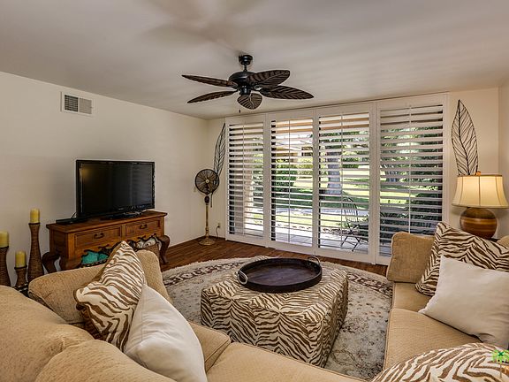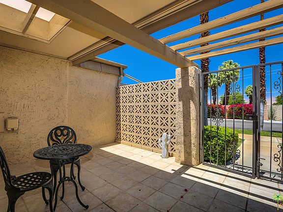 Beautiful 2 bedroom / 2 bath 1,392 square foot condo! This unit has a tropical feel, with laminate wood flooring throughout the open floor plan that combines dining and living rooms, and an updated kitchen. Unit features gorgeous southern views of the mountains and pool area from the poolside patio, and a private entry courtyard to your front door. Parking includes a detached garage space with lots of secure storage, and additional on-street parking for owners and guests. Montecito is a beautiful 32 unit complex with 2 pools, spas and lush greenbelts located within a 5 minute walk to the dining and shopping on the El Paseo of South Palm Desert.