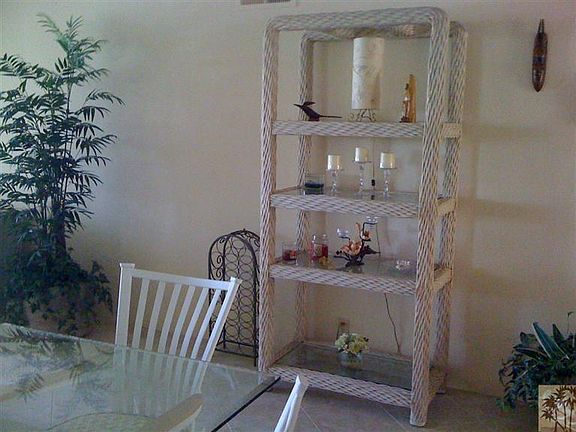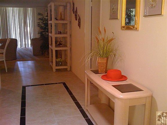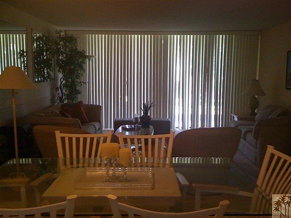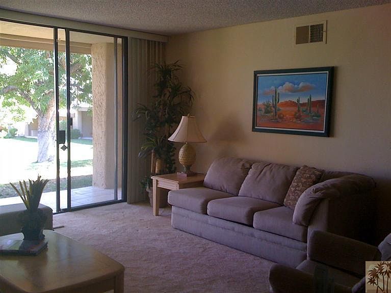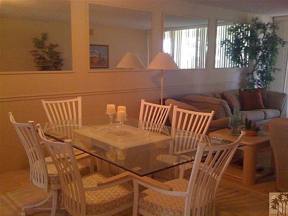 Location,Location South Palm Desert!Two bedroom and two bath over looking the pool area but far enought for privacy.Private palio outside of smaller bedroom and large outside storage.Every thing in this home is like new.Sleeper sofa in livingroom and a murphy bed in second bedroom.Turnkey furnished!!Walk to El Paseo