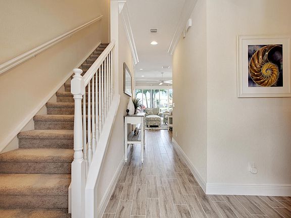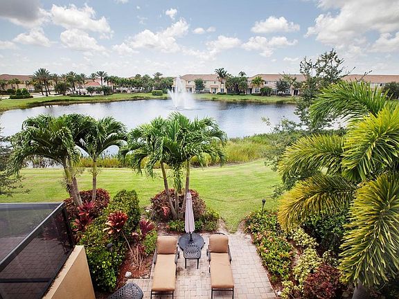 This exquisite townhome has been virtually untouched since it was constructed in 2013. Delicately lived in and smelling like new this unit was built with the developer's finest selections and finishes. Boasting 2180 sf, 3 bedrooms, 3 full baths plus a den on the 1st floor and a 2 car garage. This floorplan is called ''Juniper'' and can fit any lifestyle. On a premium lake lot, the soaring fountain is the perfect back drop as you enter the home. The endless features of this unit include high end wood grain ceramic tile flooring, stunning crown moldings, plantation shutters, impact windows, excellent storage and closet space, coffered ceilings, high end cabinetry, granite counter tops and designer back splash, upgraded bathrooms with stunning finishes, designer drapery,