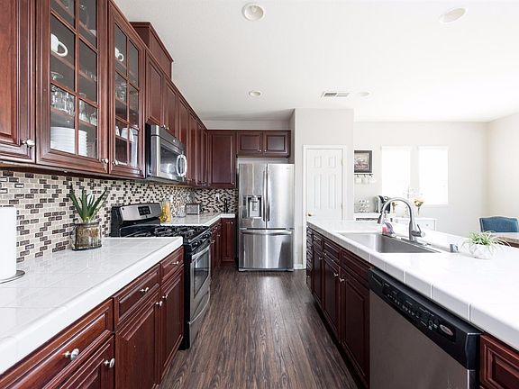 This charming home in SW Fresno is a great buy. As you walk into this nearly 1800 sqft home you see an open floor plan highlighted by the stunning laminate wood floors. To your left is the spacious kitchen which has dark cherry cabinets, stainless steel appliances, a pantry, breakfast bar, recessed, and a gas cook top. There are three bedrooms. Two on one side of the house with the master suite isolated on the other. The master bath has large tile flooring, dark cabinets and a deceptively large closet. The back yard has been customized with synthetic turf, at stone path sitting area, and a practical storage shed. Built only 10 years ago this home offers many of the energy efficiency benefits. This is a must see property.