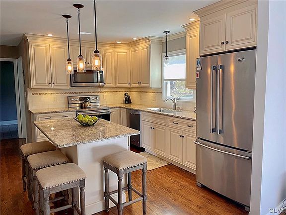 Welcome home to this beautifully maintained 3 BR, 2.5 bath side hall colonial in the highly rated Southern Lehigh SD! This home features gleaming hard wood flooring throughout, updated kitchen with granite counter tops and center island. The open concept kitchen/dining room is great for entertaining and includes sliding doors to the backyard deck when the weather takes the party outside. The first floor includes a spacious living room, family room with wood burning fireplace, powder room, glass enclosed room with built-ins and a laundry closet. Upstairs you will find 3 spacious bedrooms and updated hall bath. Large master bedroom includes 2 generously sized closets along with an updated master bath with double sink and newly tiled shower. Heading down to the finished basement you will find a large tastefully tiled living space and bar for entertaining, along with 2 large storage closets. A one car garage & lovely backyard with nicely sized shed completes this beautiful home.