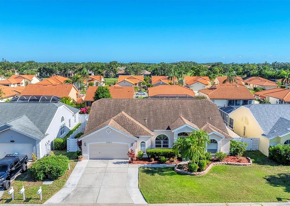 **Back on market due to no fault of the property or seller. Buyer withdrew after a personal situation arose unrelated to the transaction.** Experience the best of Florida living in this thoughtfully updated three bedroom, two bath pool home that blends everyday comfort with elevated design. Volume ceilings soaring to 18 feet create a bright, open atmosphere the moment you walk through the door. The kitchen is as functional as it is stylish, featuring granite countertops, soft-close cabinetry, newer stainless steel appliances, and a cafe area with built-in bar and an aquarium window. Just off the kitchen, a family room offers an easy flow for entertaining or relaxed nights in. Formal living and dining spaces with laminate flooring provide flexibility for gatherings large or small. The split-bedroom layout ensures privacy, with the owner’s suite offering marble floors, a walk-in closet, and direct access to the pool. The en-suite bath includes a double vanity, soaking tub, and walk-in shower, your own private retreat. The two additional bedrooms are served by a full bath that also functions as a convenient pool bath. Step outside to your private backyard oasis. The southern-facing pool is perfect for sunny afternoons, complete with new tile, travertine decking, a peaceful water feature, and a sun shelf ideal for lounging with an umbrella. Additional features include an expanded laundry room with sink and storage, central vacuum system, and a widened driveway with 8 extra feet for added parking. This home offers the space, layout, and amenities to enjoy life, indoors and out, with style and ease.