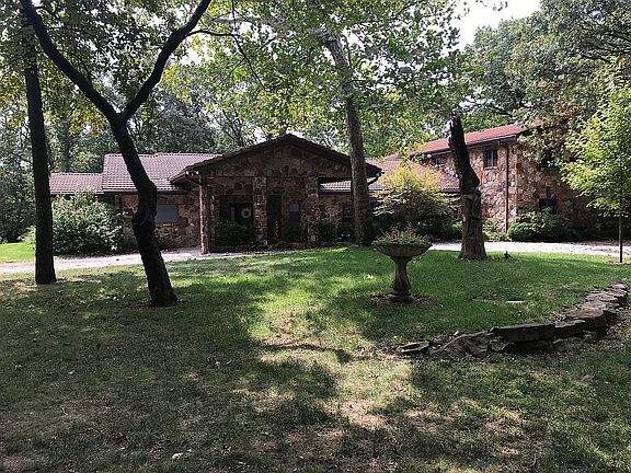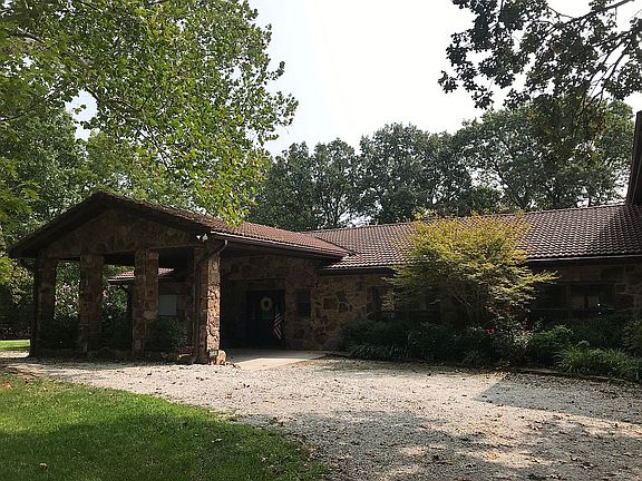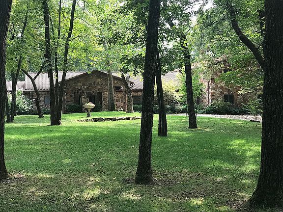 Serene wooded lot with rock home on a bluff overlooking Center Creek Circle drive with covered drive through Open floor plan with views from all rooms with new flooring throughout Grand living room with 72" ceiling fan and large rock fireplace Master bedroom with his/her walk in closets Master bath with granite counter top and vessel sinks Tiled walk in shower with body jets and bench Large whirlpool tub with wood and tile accents Kitchen has granite counter tops, double dishdrawers and walk in pantry Sunroom/breakfast area off of kitchen Guest bath has granite counter top with vessel sinks Formal study/extra bedroom with built in shelves and cabinets Media/dinning room with cabinets Large laundry room with sink, room for a spare fridge, counter space & cabinets Central vacuum system Attached 3 car garage with storage cabinets and work bench Additional detached 2 car garage or shop In-ground salt water pool with new liner Landscape lighting in deck area Full yard sprinkler system Clay tile roof Wood and stone stairs allow access to the creek from the deck Rocked in barbeque area with Carthage marble table Storm cellar/safe room