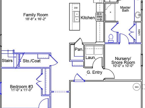 The Gwinnett is a 3 bedroom, two bathroom single-story open plan. The kitchen features a large island and pantry and is open to the family room and eat-in area. The primary bedroom is split from the secondary bedrooms and features a walk-in closet, dual linen closets and a water closet. The laundry room is conveniently located off of the garage entry. Options include a conjoined to primary, nursery in lieu of the 4th bedroom, and an upstairs bonus room. Additional upgrades include white cabinets throughout, LVP in common areas and stainless appliances.