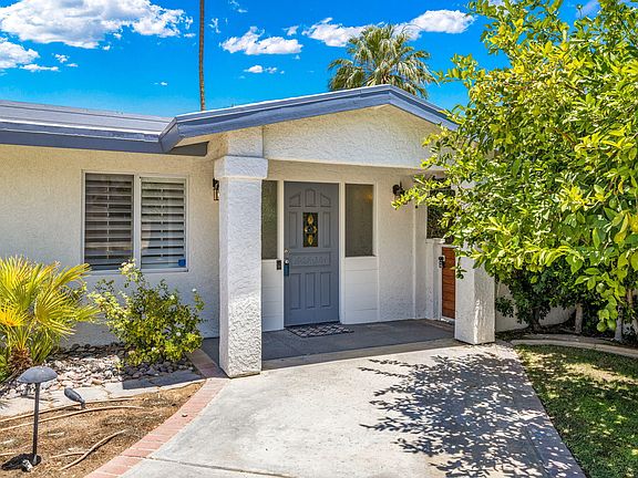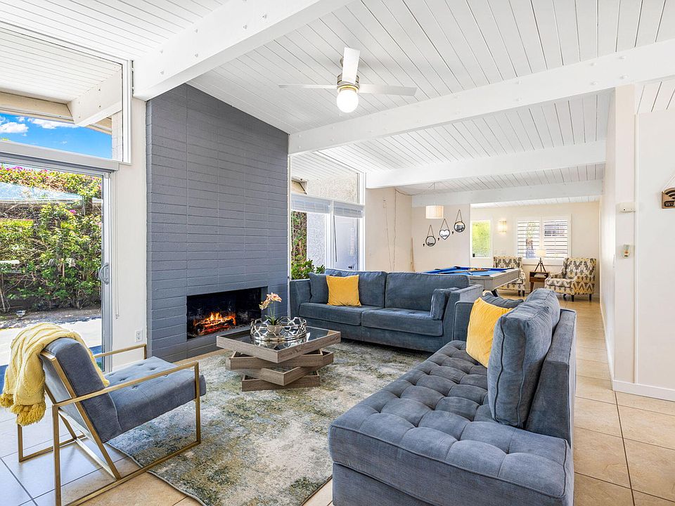 Location, location, location plus a rare short-term rental! Don't miss this true mid-century modern gem just a few blocks from EL PASEO shopping and dining! This gorgeous three bedroom and three bathroom, approximately 1,736 square-foot property has an open floor plan that allows for a light and airy flow from room to room, boasting a newly renovated kitchen, three baths with a spa tub in the primary and gorgeous celestial windows. Enjoy classic tongue and groove ceilings, a brick fireplace, tile flooring throughout and the convenience of a Ring doorbell and a Nest thermostat. Relax on the patio and soak up the sun. If you've had enough sun, head over to the covered patio. The backyard is super private with mature landscaping and has plenty of space. One of the few single-family residences in Palm Desert with no HOA's which allows short term rentals! This property is just a few blocks from the Shadow Mountain Golf Club. Don't miss this rare opportunity to own a short-term rental behind EL PASEO!