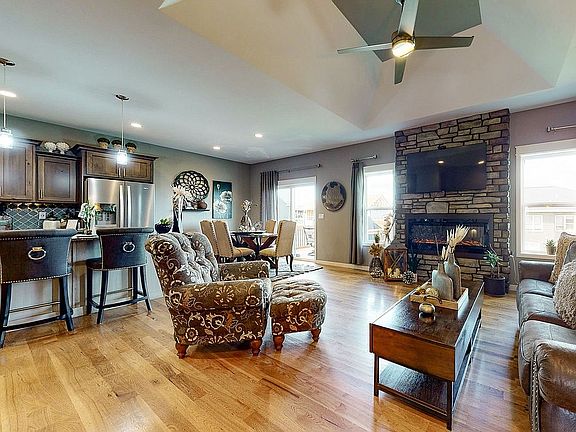 PRICE REDUCED! BUYER'S AGENTS WELCOME! Spectacular, very well maintained, move in ready 2017 Schrage Parade Home includes 9 foot ceilings throughout! Main Floor Master BR includes tray ceiling with adjoining Master Bath. MB includes upgraded tile shower with dual showerheads (main and rain head), dual vanity and walk in closet. Main floor laundry with folding counter and wood lockers. Kitchen includes oversized farmhouse stainless steel sink, breakfast bar, oversized walk-in pantry, tiled backsplash and Whirlpool kitchen appliances that stay with the new buyers. Living Room/Dining Room boasts floor to ceiling stone gas fireplace with TV insert, hardwood floors, tray ceiling and slider to newly stained deck. Fully finished walk-out lower level with 9ft ceilings, large windows, wood laminate flooring, large living room area, carpeted office area, large 4th bedroom and large bathroom with tiled shower/floor with cabinets with tons of storage. A large, unfinished storage area that spans the length of the lower level. The outdoor area includes fenced yard, deck with child/pet gate, stamped concrete lower patio, new rock landscaping across the back fence line with trees, bushes and perennials for color all summer. New landscaping on the sides also includes more beautiful perennials for easy maintenance. Newly painted 3 stall garage with Cable TV access. Close to the park. Great, friendly, quiet neighborhood.