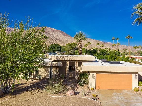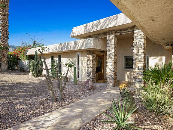 If you're looking for a four-bedroom home in South Palm Desert within walking distance of El Paseo, your search ends here. Situated on a large lot with mountain views in all directions. High quality construction featuring solid wood doors, slate tile floors and granite countertops. Built in 1972, the property's façade features clean lines, stacked stone columns at the entry, and floor to ceiling windows which allow ample light to fill the large main living area. Beyond the dining room is an updated kitchen with solid cherry Kraft Maid cabinetry, stainless appliances, wine fridge and views out to the pool and the mountains. Next to the kitchen is a den with fireplace perfect for gathering with friends or family. Relaxing primary bedroom suite is filled with light and leads out to the pool via a spacious covered patio with outdoor barbecue grill. Three guest rooms for a large family... or two ''work from home'' offices plus a bedroom for guests! Are you a swimmer? You'll love the pool-jet pump system which transforms the pool into an aquatic workout system! Dual zone AC and evaporative cooling. Owned solar. Low maintenance landscaping. Fee land. No HOA. The best value in this highly sought after neighborhood. Call today.