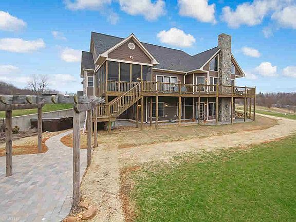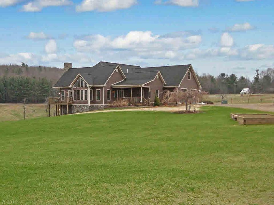 Beautiful Handcrafted Home built in 2009 nestled on 22 cleared acres with a pond! This Energy efficient Home has 1/3 of electricity costs from windmill and solar panels on property! Home features gorgeous hardwoods that line the Home throughout,a large Open Style completely renovated, upgraded gourmet kitchen;that flows into an exquisite living room with vaulted ceiling, a mesmerizing stone custom built fireplace, and large one of a kind windows! Home also offers a covered front porch,a lovely sunroom, huge deck with amazing views,attached 2 car garage and detached 4 car garage with loft,updated bathrooms,fully finished basement with wetbar and covered walkout;that leads to your very own hot tub!
