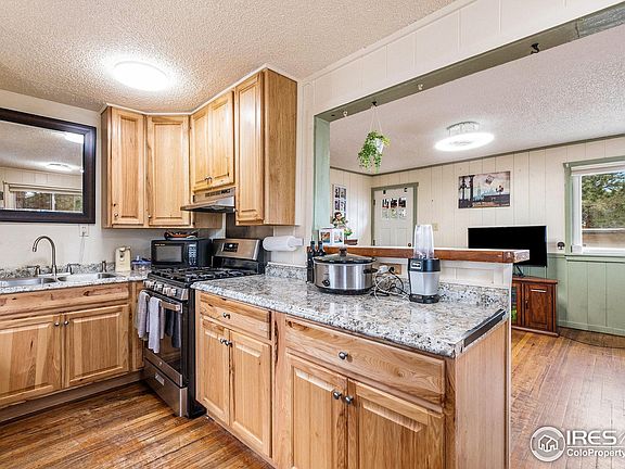 Great first home or investment property. Affordable Estes Park Home with 2 Bedroom, 1 Bathroom in quiet & convenient location close to downtown and schools. All new kitchen appliances installed when kitchen was remodeled in July of 2020 along with new water heater. New roof put on in 2017. Ranch style with open floor plan, enjoy the views of Lumpy Ridge from the deck. Additional storage in shed for all those extras. Wood floors throughout, sweet home with everything you need including: washer/dryer, dishwasher, gas range/oven. Property ownership comes with 1/8 undivided interest in the common area. Time to stop renting and own your own home.