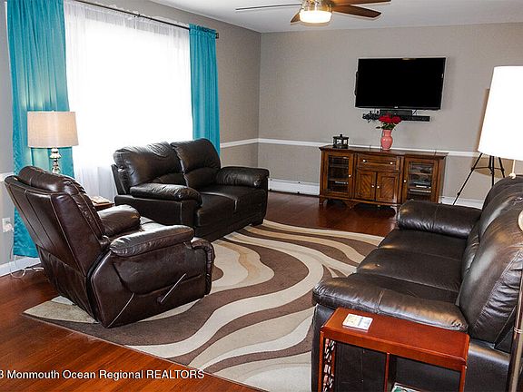 Welcome home to this well kept ranch in desirable Lake Riviera section of Brick. Offering 3 bedrooms, a full bath with tub, living room and large kitchen with dining area. One car garage has direct access to the home. New great room with Mohawk Millport Hickory waterproof flooring is through the sliders with an exit to the spacious deck, large yard and above-ground pool. First floor is freshly painted with Strand Bamboo flooring throughout. 150 amp breaker box. Large basement is partially finished with lots of extra space.