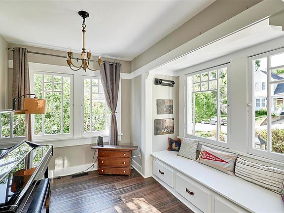 Renovated & well-appointed 2-story craftsman home with an open floor plan in sought after Webster Groves. 4 bedrooms. 2.5 bathrooms. Rare find–incredible 25’ x 44’ garage. Recent updates: covered front porch with low maintenance tongue & groove flooring; HVAC system; unfunctional fireplace converted to functional fireplace, R49 insulation in attic; seamless color gutters. Entrance welcomes you to the sitting room with built-in seat. Spacious living room with fireplace. Bonus room off living room. Stylish kitchen with white cabinetry, subway tile, solid surface countertops & large center island/breakfast bar with contrasting cabinetry with butcher block countertop. Coffee bar & main floor laundry. Large dining area. Spacious backyard patio & deck lead to fenced backyard. Gorgeous wide-planked, hardwood floors throughout. Beamed ceilings. Craftsman casement windows. Upstairs a light-filled primary bedroom with remodeled bathroom along with 3 more bedrooms & remodeled hall bath. Must See!