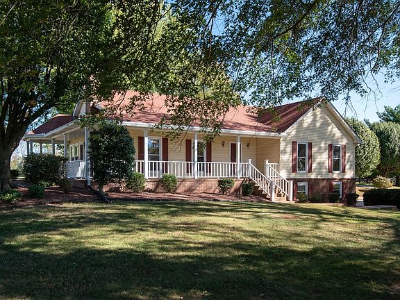 The house has a balanced, practical design with a wraparound porch and a comfortable flow between rooms. Inside, hardwood floors run throughout the main living areas, and large windows let in plenty of natural light. The kitchen includes generous cabinet space, functional countertops, and a layout that connects easily to the rest of the home.