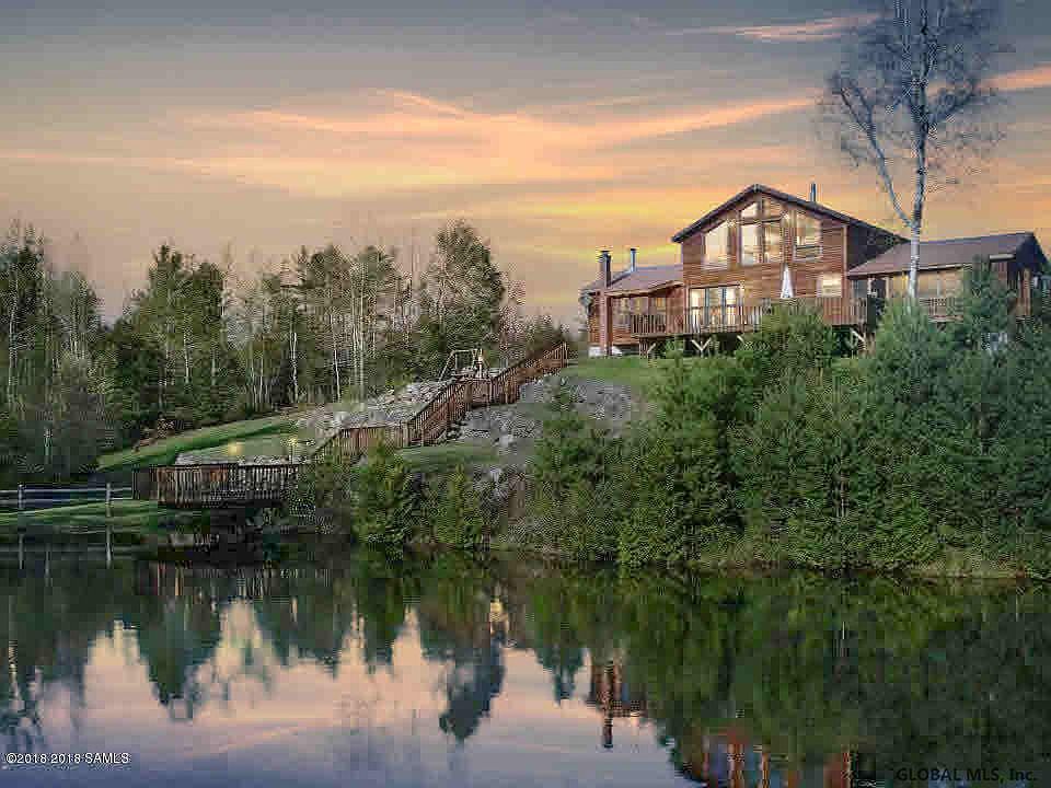 Located in the Southern Adirondacks, this beautiful home is nestled back on a quiet 36 acres at the end of a private 2/10ths mile driveway. Great private location for kids, dogs and adults to enjoy all the Adirondacks has to offer! Home overlooks a private, spring fed pond (with two waterfalls and stocked with native brook trout!) and includes a 5 stall horse barn, detached garage and numerous outbuildings plus 2 fenced in paddocks, and trails throughout the property for horses, snowmobiles and hiking. Open floor plan w/Great Room and phenomenal mountain views, hardwood floors, full finished basement (with bar & disco light!), updated appliances, Master Suite w/gas fireplace and so much more! Just 40 minutes north of Saratoga and 15 minutes to Gore Mt.