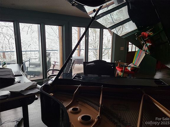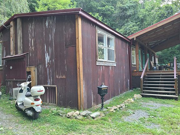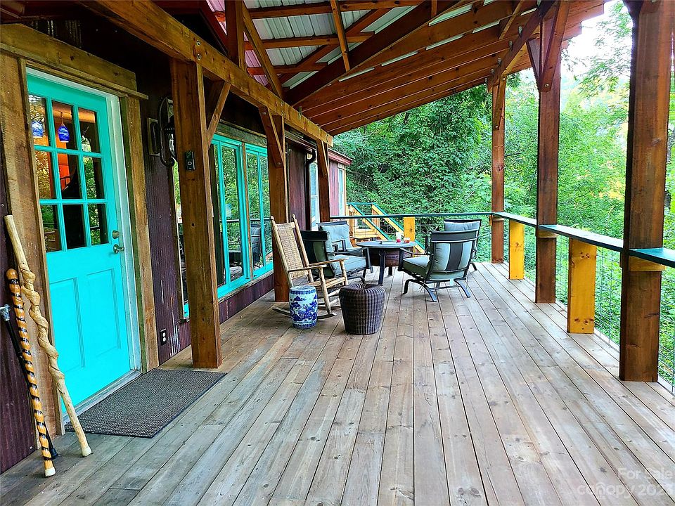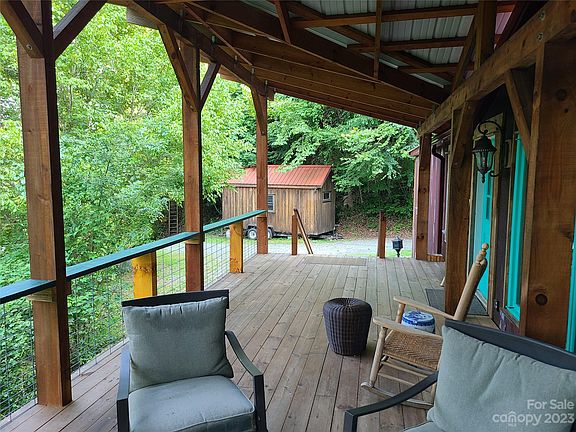 Riverfront Retreat on 4.87 Acres. Discover this hidden gem in downtown Marshall! Private riverfront oasis nested at the end of the road. Spacious yard right along the French Broad River. This charming artist's house is a true masterpiece, featuring 2 expansive decks w/ breathtaking river views. Exterior - rustic tin reclaimed from Madison County's historic barns. Trail leading to a river bluff cave deck—a serene spot. As winter & fall set in, cozy up by the old parlor stove. Mini-splits for year-round comfort. Guest suite with a private deck is perfect for visitors. Recent septic inspection results are excellent, cleaned septic tank w/a new filter. Potential 4 bedrooms, listed as 2 bedrooms, office, bonus room, and 2 baths. Kitchen overlooks the backyard w/ a creek view. New flooring in 6 of the 9 rooms. New metal roof. Enjoy a small beach area & launch your boat into the River. Don't miss out on the opportunity to make this riverfront haven your own!