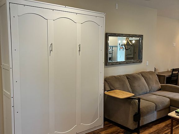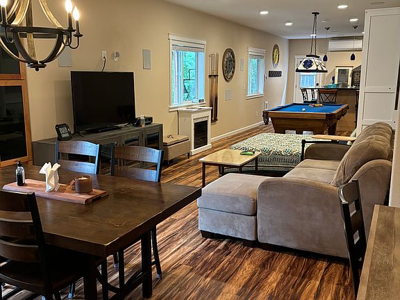 Daylight fully furnished basement/in-law suite with tall ceilings and its own private entrance. Basement comes with a full kitchen with 4 bar stools, 3/4 bath with a huge walk in tiled shower, Queen size murphy bed, large sofa, dining table with chairs, desk, electric fireplace, 55" tv and a pool table. Kitchen has a china cabinet and is fully stocked with a microwave, Keurig coffee maker & other small appliances including dishes, drinking glasses and pots and pans. There are built in cabinets with lots of storage. There is a big deck off the slider door. All utilities paid, including internet and cable. Owner pays for all utilities, including cable and internet.