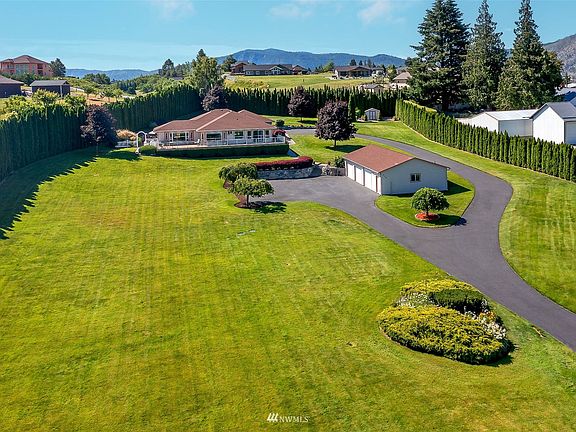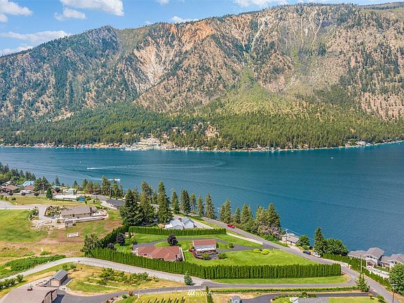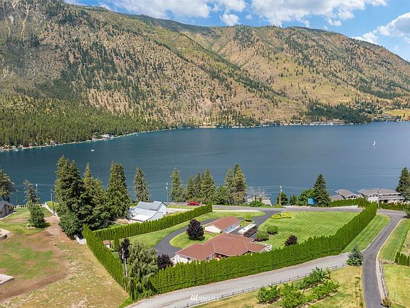 Estate sized living in a serene setting w/stunning Lake Chelan views! You'll think you're driving through a 1.85 acre park as you approach this sprawling rambler w/attached garage. On your way you'll pass by a detached 1232 sq ft 3 bay garage/shop & RV parking with hookups. An oversized patio w/gardens & waterfall welcome you to the home's main door. Inside is a spacious great room & large wrap-around deck open to the view. The kitchen has custom cabinetry & built ins as well as a huge walk in pantry. The fireplace is perfectly placed to provide ambience to the entire great room. A large primary suite with walk in closet & bath w/jetted tub also offers breathtaking views. A truly spectacular property offered for sale by its original owners.