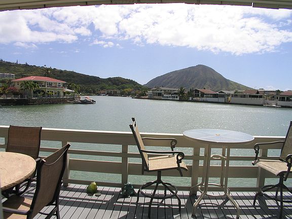 What you've been waiting for. Kuapa Isle single story 3 bedroom/2 bath on the wide part of the marina with spectacular views of KoKo Crater, KoKo Head and he Ko'olau Mountains. Enjoy your own personal boat dock and two outdoor lanais which provide loads of outdoor space for BBQ and relaxing. Enjoy minimal electric bills with the solar system that transfers with net metering. 16" Tile floors are in all the living spaces. All three bedrooms have a neutral 12" tile for cool, easy living. The kitchen and bathrooms have white plantation cabinetry and stylish granite countertops. Cabinets in the kitchen boast a nice sized pantry including pull out drawers in pantry and all bottom cabinets for easy access to all your cookware. All Stainless appliances will remain with the unit. Patio sliding doors in the living space and master bedroom have the in-between the glass window blinds. Kuapa Isle is a controlled access community with large well kept green belts throughout the area. Master Bath has a large granite vanity with a bathtub and shower. Guest Bath has a large granite vanity and shower. All furniture and household items are available.