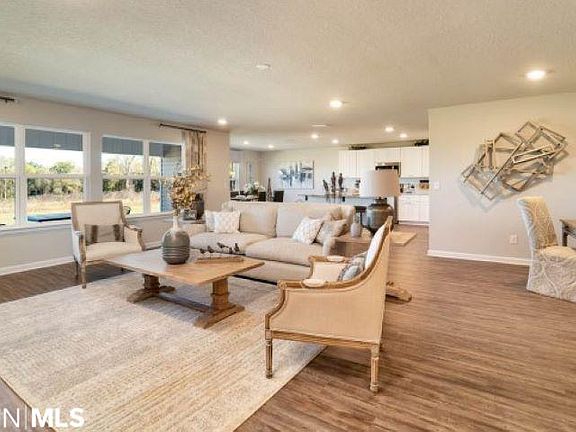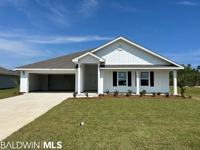 RALEY FARMS PHASE 2! Raley Farms is located within 15 minutes of Gulf Shores sandy white beaches! Located off of County Rd 8, this large lot DENTON floorplan with a front porch offers a ton of useable space. This open floor plan 4-bedroom, two bath home features granite throughout the home, luxury vinyl plank flooring throughout, garden tub, walk in shower, huge walk-in closet in the primary bedroom, LED lighting package, gorgeous white cabinetry, and is to be built to Gold Fortified Home TM Certification, which may save the buyer on homeowner's insurance. The home will also include a smart home package. Raley Farms also features a private pool area surrounded by big oak trees and backing up to a little pond for maximum relaxation. The DENTON plan also includes a wide covered back porch area for catching sunsets or entertaining guests. ***Pictures are of similar home and not necessarily of subject property, including interior and exterior colors, options, and finishes.*Home is under construction. lot 114. Estimated completion is July 2023.