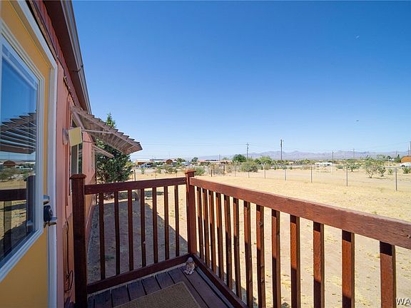 "This one-acre, fenced and cacti-cleared farmette is loaded with updates and amenities! Featuring: master suite with open shower/bath design and patio door to deck; remodeled kitchen with new cabinets, appliances (2023), and laminate flooring; new windows and water lines (2022); new ac/heating units (2022-2024). Enjoy sunrise/moonrise views from new deck off screened porch. The 3-car garage with electric panel and water, has pull through doors. The 3rd door has opener with remote. Two animal pens and a 6 x 8 hay shed adjacent to garage. Two entry gates, one electric with remotes. Conveniently located just off the main highway, between Kingman and Bullhead City/Laughlin and the beautiful Colorado River."