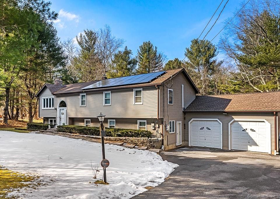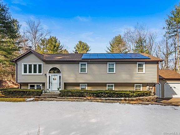 Gorgeous, impeccably maintained raised ranch w/updates galore set on a private 1.23-acre level lot. Pride of ownership is seen throughout this special 2,328 sqft 4 bed, 2.5 bath property. The beautifully updated kitchen is equipped w/stainless steel appliances, cherry cabinets, & a custom tile backsplash. A formal dining room extends into an amazing cathedral ceiling great room w/tile fireplace. Hardwood floors extend throughout most of the main floor. A spacious master bedroom leads to a gorgeous, remodeled master bath oasis w/new quartz vanity & tile shower. The 1st floor is completed w/3 additional bedrooms & an updated full bath w/quartz vanity & tub shower. A slider in the dining room leads to a 3-season enclosed sundrenched porch. A spacious finished lower level offers endless opportunities w/a family room, office & game room, ½ bath w/wood stove. Sliders from the dining room take you to a deck overlooking a sprawling yard with an expansive lawn, perfect for all your outdoor entertaining. The property is located next to River Park w/access to the Willimantic River. Great for fishing & outdoor fun. Additional updates/amenities include: new windows, new slider, newer hardwood floors, remodeled baths main level, generator hookup, split AC/Heat system, new leaf filter gutters, 2-car attached garage, playscape, new shed. Perfection of location, easy access to I84, 15 min to UCONN & 25 min to Hartford. Don't miss out on this turnkey property