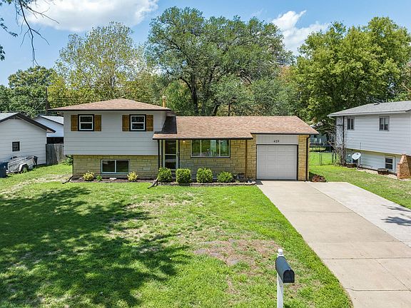 Welcome home to 459 S. Spring Creek in Derby! This tastefully updated tri-level home has been fully updated throughout, providing 3 bedrooms, 2 fully remodeled bathrooms, new laminate flooring in the lower level, refinished hardwood on the main and upper levels, fresh interior and exterior paint in April 2023, all new light fixtures, new landscaping in front, and close proximity to parks, the Derby Rec Center, shopping, restaurants, and entertainments! Upon entering you will be welcomed by the inviting living room with newly refinished hardwood flooring, ceiling fan, and large windows to bring in the natural light. The light and bright kitchen features gorgeous newly installed quartz countertops and tile backsplash, a tip out tray in front of the sink for extra organization, new Hisense dishwasher, and all stainless steel kitchen appliances remain with the home. Off the kitchen is the dining area with an elegant chandelier and sliding doors to the outside patio. On the upper level are three bedrooms with hardwood flooring, large windows, plenty of closet space, and a fully remodeled bathroom. Sit back and relax in the lower level that is complete with new laminate flooring, view out windows, recessed lighting, an added full bathroom, and a separate laundry room. Hang out in the fully fenced backyard with a newly poured 15' x 15' patio area, firepit, storage shed, and tons of space to have family and friends over for summer get togethers! Do not miss this great opportunity! Come see this home today!