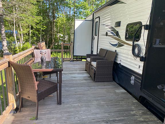Seasonal Rental at Sandy Shores RV Resort in Midcoast Warren Maine. Available to be rented until the end of the season, October 31st. If rented until October 31st, it will be $8000 or $2000 per month (season discount)! This rental includes 2018 Palmino Puma 39pqb, it is in very good clean condition. There is a very comfortable queen bed, and also two pullout sofas. Everything works, AC is very cold! There is also an outdoor kitchen, and table and chairs on the deck for entertaining. Also, there is a picnic table and fire pit on site for your convenience. This includes full use of all Sandy Shores ammenities, pool, clubhouse, bathhouses, and social events. This rental will include electricity up to $150 per month, you will be responsible for internet (it is already wired for spectrum) or just bring a starlink if you have one. There is free WIFI at the club house and I do get a AT&T cell phone signal at the site. Located along the shore of the 500 acre South Pond Lake access for small boats Aluminum dock to fish from or to pick up boat passengers Air conditioned/heated clubhouse with a small library, games and fully equipped kitchen opening out onto our pool deck FREE high speed internet in the clubhouse Beautiful saltwater pool Horseshoe pit, swings and basketball hoop, pickleball court Two immaculate bath houses with coin operated washers and dryers Overflow area for boats and trailers Rental must be a minimum of 30 days and subject to association approval. Renter will be responsible for emptying the waste holding tanks, so some rv knowledge is required, it is pretty simple. Please no cigarette smoking inside!, and dogs will be considered on a case by case basis $300 non refundable deposit. This listing is also for sale, and you own the land! $105,000 it is listed on the MLS. Seasonal Rental