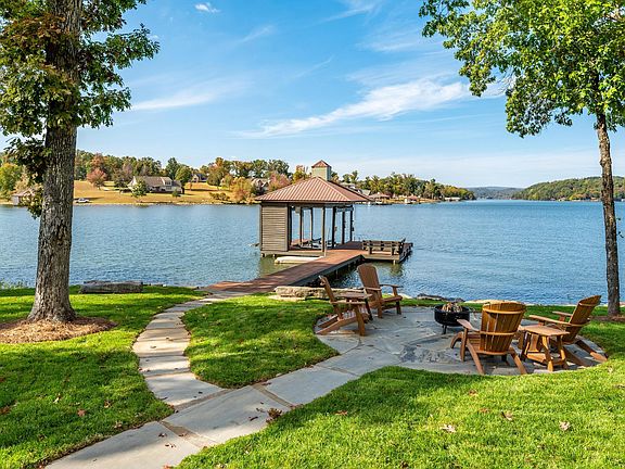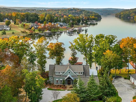 From entry to end, you are greeted by freshly refinished heart pine floors and knotty pine shiplap clapboard walls washed in soft whites and sea foam blues throughout the main level warming each room and relaxing your very existence. Whether up or down, every area of living and dining to include all four bedrooms overlook endless big water views offering the most majestic sunsets. An expansive family room invites entertaining extended family and friends comfortably opening to the kitchen, spacious eating area and keeping room. Recently renovated, the revitalized kitchen offers all new appliances with gas cooking and an abundance of counter and island prep/serve opportunities. Stack stone fireplaces easily warm the living and dining areas setting the tone for more intimate, relaxed moments with just family. Master retreat is tucked away on the main floor embracing spectacular waterfront views and lush green landscaping in a park-like setting to the water and covered dock. Living and dining areas expand a life as richly lived outdoors as it is inside to the screen porch and open decking spanning the entire back. Pella floor to ceiling windows and exterior doors fill all rooms with natural light not only allowing opportunities for great views but for greater efficiency. Solid, wood interior doors adorn rooms and reinforce additional quiet and peaceful sleeping in all bedrooms. An open staircase and balustrade with branch accents while built for function is in itself a beautiful work of art defining the living areas from the dining areas but was also strategically designed to frame the endless, panoramic water views outside. Second level offers three oversized guest bedroom suites, all embracing incredibly gorgeous water vistas with walk-in closets with two offering built-in bunks with additional sleeping quarters in the trundles under each. Ideal for generational visits or ownership allowing for your entire family to gather comfortably together. Casual living is promised and has never been more inviting. Deep garage offers valuable vehicle parking but also plenty of space for all your recreational toys with a second level, walk-up storage area providing endless possibilities for expansion such as a separate guest suite. Life just does not get better than in the gated waterfront community of Lakefront Estates with natural walking or biding paths, separate community RV, Boat and trailer parking, community clubhouse with fitness center and located halfway between Chattanooga and Knoxville. You capture the best of all worlds. Home, there is no place like it than when it is on the water! Owner/Agent