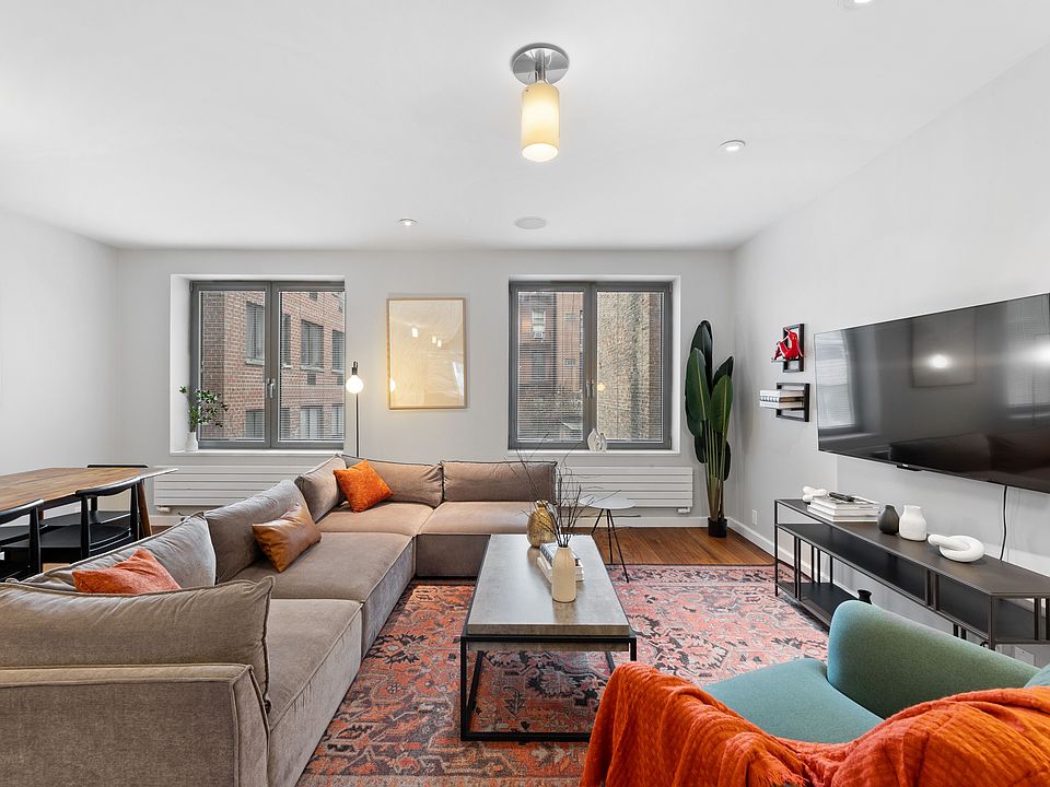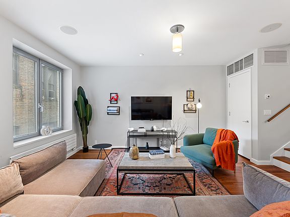 Welcome to Gotham House II, this unique and stunning duplex on the 3rd and 4th floors boasts a keyed elevator, a custom-designed open chef's kitchen with high-end appliances, ample cabinet storage, and a breakfast bar. The master bathroom features double sinks, a deep jetted soaking tub, and built-in storage, while the second bathroom offers spacious double sinks and a deep soaking tub. A beautifully tiled third bathroom includes a walk-in shower. Additional features include central AC, a stacked LG washer/dryer, walnut flooring, recessed lighting, high ceilings, abundant closet space, and internal speakers.