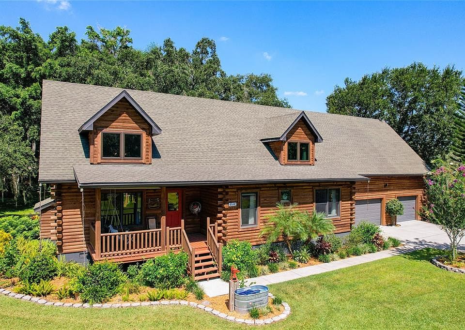 Welcome Home to this Stunning 4 bedroom Custom Luxury Log Home, exceptionally crafted and immaculately maintained. Nestled on a generous 1.2-acres, with NO HOA, this property offers the perfect haven for a Multi-Generational Family, boasting not only a Spacious Main House but also a semi-detached Guest Cottage. Step onto the inviting front porch and through the entrance, where a two-story great room bathed in natural light awaits. The room features a captivating stone fireplace under a beautifully vaulted wooden ceiling, complemented by a distinctive chandelier. As you turn to the Dining Room, you pause to delight in the double french doors leading to the open deck and screen enclosed lanai, offering breathtaking views of your Tropical Florida Paradise. The Modern Farmhouse Kitchen, illuminated by upper and lower cabinet lighting, showcases New Stainless Steel appliances, Granite counters, a Center Island, large Pantry, and a large Laundry room. Also on the first floor, a captivating Master Suite, complete with a private sitting area, built-in shelves, walk-in closet, and an ensuite bathroom with walk-in shower and a distinctive wooden tub, invites you to relax at the end of the day. Additionally, a pleasant alcove adjacent to the master suite can serve as a home office, music room, or library, while a half bathroom accommodates your guests. Ascend the grand staircase, crafted from hewn logs, to discover a Charming Loft on the upper level. Here, two generously sized bedrooms with dormer windows and a handsome bathroom with clawfoot tub and walk-in shower await. Both bedrooms offer ample walk-in closets, and through the largest, discover a versatile bonus room, recently used as an additional bedroom, that would make a great home theater, playroom, or craft room. As you explore the property further, you'll find an expansive two-car garage for the main house and a separate one-car garage for the guest house. The Guest Cottage, accessed around the right side of the property, with it's own private front porch, offers a large living room, full kitchen, dining area, and a second Master Suite with a spacious walk-in closet and a full bathroom. This fully Wheelchair-Accessible Cottage is ideal for beloved parents/in-laws, visiting guests, or even as an income-producing rental. Outside, the meticulously maintained park-like backyard awaits, fully irrigated and adorned with landscape lighting. Relax in your hammock under mature shade trees, explore the charming flowering gardens featuring plentiful fruit trees, and enjoy farm-fresh eggs from chickens in your very own chicken coop! There's even room to park your RV or Boat, and a large shed for storage. With the entire house freshly stained (2021), and termite warranty in place, you can have peace of mind knowing this home is as solid as it looks. Come Enjoy all the benefits of close proximity to shopping and restaurants, and the tranquility and privacy of Country Living. Come Discover the unique beauty of this exquisite Log Home and experience your Best Life as you make this exceptional HOME your own!