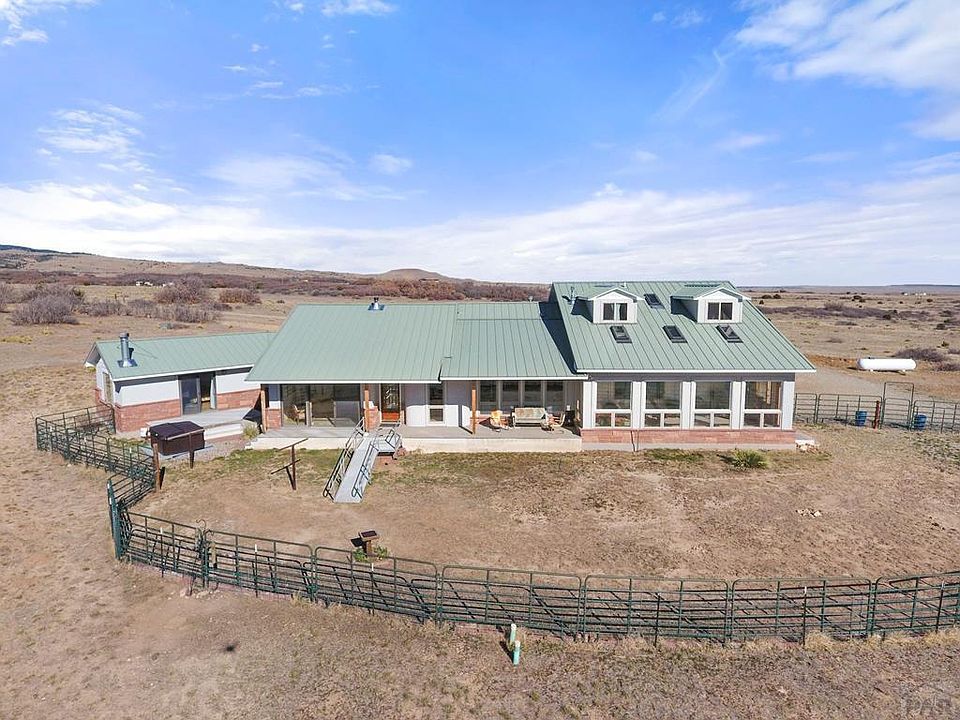 The ever changing prairie sky & the beauty of historic Spanish Peaks welcomes you to this private, thoughtfully built, low maintenance sandstone & stucco house on 73 acres of prairie. Your private adjudicated well flows with clear cool water - drinkable without any kind of filtration - at 12 gallons a minute. The house is built with double wall insulation, travertine & maple floors & has sumptuous views from every window of mountains & distance prairie. The kitchen has Viking appliances, maple cabinets & long stretches of granite countertops. The house was designed to have flow for both gatherings & private spaces. The serene, private main suite has close western views of the Greenhorn Mountain. Main spa bathroom with soaking tub, French sink & walk in view shower.