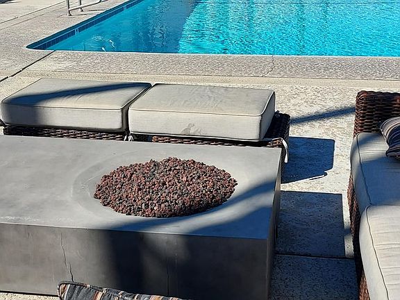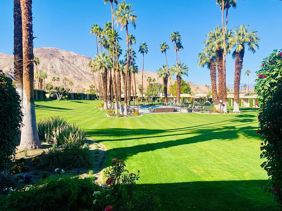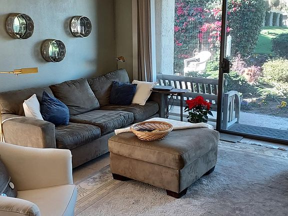Available for furnished monthly rental! First time rental of 2BR/2BA 1.5 blocks from El Paseo in Palm Desert, CA. Single level condo with floral desert landscape in the front and exquisite views in the back of resort-like grounds with pool, hot tub, outdoor fireplace, BBQ. The quintessential Palm Desert-Palm Springs experience. Walk to El Paseo Dr for world class shopping, restaurants, or morning coffee. Relax in the outdoor living-room & read a book under the palm trees with mountain views or sip lemonade in the shade and watch your loved ones at the pool from the convenience of your private patio. Located within a quiet & private community where rentals rarely come available. Sleeps 6 (1King, 1Queen + Sofa bed). Amenities include washer/dryer, massage chair in master, electric fireplace in living room. Master bedroom faces sitting patio and pool area; guest room faces small private patio and private entrance. No smoking. Call for more info! Renter is responsible for utilities. 30 night minimum. No smoking. No pets. Parking included.