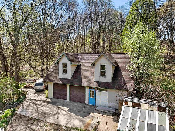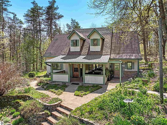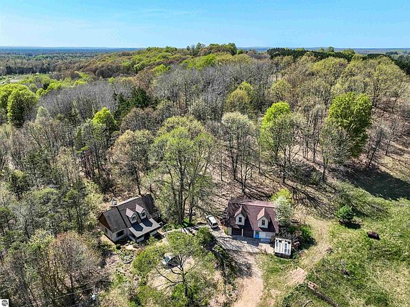 Gorgeous rolling hilly wooded 20 acres all naturally landscaped - lilacs, magnolia tree, many perennial gardens, old orchard and large garden area too! This custom home was lovingly positioned off the road and adorned with all of nature's beauty and left that way (bonus: no yard to mow!). If you are looking to be one with nature and find seclusion & privacy, this property is calling you! The home incorporates many natural features inside as well - stone, wood etc. The owner has beautifully painted murals in various areas to brighten the inside during the winter months. Charming style from the stone retaining walls, brick pavers, covered front patio - not a cookie cutter style home but one with character! Main level has pine ceiling and brick faced wood fireplace for added warmth & coziness. Upper level has a wet bar that opens up to the family room - or turn the entire upstairs into a large main suite with ensuite bathroom. Dormers have built-in storage/dresser & attic closet space. Lots of natural lighting! Detached garage has plenty of room for vehicles and a workshop plus the second story is ready for the next owner to finish it - could be an apartment, recreation room... options galore! Buy "Up North" and be within 30-40 min of Big Rapids, Cadillac, Manistee, Ludgington and all the areas in between that offer 4-seasons of fun! Close to rivers, trails and 32 min to Lake Michigan. Amazing location on county maintained paved road!