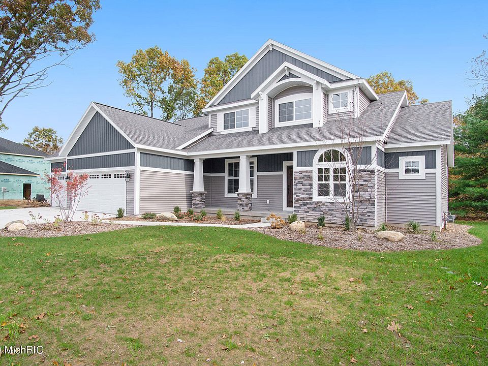 The beautiful Dickenson home in our Oak Harbor neighborhood in Cascade Township. This home is located in the award winning Forest Hills School District. Home comes equipped with a gas fireplace, granite counter tops, tile shower, third stall garage, laminate wood flooring, boot bench, and slate appliances including hood vent This home also features a large bonus room above the garage.