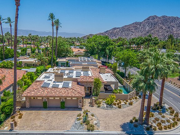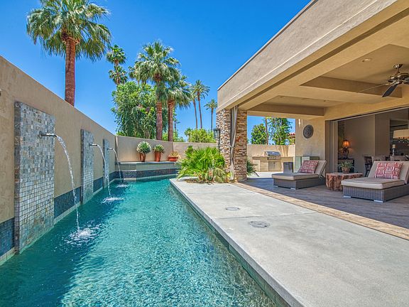 Custom-built and designer-finished home across the street from both Eldorado Country Club and The Vintage Club offers high ceilings, an open floor plan and a private south-facing pool and spa that offers views of Mt. Eisenhower and the surrounding mountains! The finishes on this showcase home are spectacular. This home is within minutes to El Paseo's restaurant and retail row, has special upgrades including a paid-for solar system, and receives all of the benefits of being an Indian Wells resident including access to hotels, discounts on golf and so much more! The large great room includes a gourmet kitchen styled up with custom cabinetry, stainless appliances and a large island that opens to the dining and living areas. You will love the motorized sliding glass doors that pocket into the wall providing full and easy access to the large covered south-facing patio that offers views and enjoyment of the outdoor fireplace, built-in BBQ and refreshing pool and spa. South-facing Master Suite has high ceilings, views, access to the pool and spa, two walk-in closets and a private spa-like bath with dual sinks, a walk-in shower with triple showerheads and two separate toilet/water closets. On the other side of the home are Junior Ensuites Two and Three each offering their own private bath and exterior patio. The media room (optional Bedroom Four) also opens to a private patio! Attached three car garage with AC, too! Designed & built by Mike Fedderly.