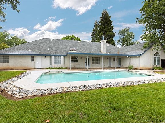 This property truly has it all! Over 3 acres in the stunning Carriage Estates neighborhood on the North side of Chico. In-ground pool, 3 Car Garage, plus room for RV & Toys! This home offers 5 bedroom and 3 full baths. It is a split floor plan with one bedroom and bath on the opposite side of the home from the master and other bedrooms. As you enter the property, there is a large circular driveway and ample parking. There is tiled foyer as you enter with a large formal living and dining room. These rooms are light and bright with tall ceilings and recessed lighting. There is new scratch resistant engineered/laminate wood flooring throughout the living spaces. At the back of home is the great room/family room which features vaulted wood beamed ceilings a woodstove. The spacious kitchen is open to the both the family room and the breakfast nook, with bar/counter seating on both sides. Brand new stainless steel appliances have just been added to the kitchen. The kitchen and family room look out over the swimming pool and the pasture beyond. All of the bathrooms are spacious with plenty of cabinets and storage and double vanities. The master bedroom is enormous, with his and hers walk-in closets and separate vanity areas. There is a jacuzzi tub and a french door out to the pool. There is new carpet in the bedrooms, new lighting and hardware throughout. Pool equipment was recently replaced. So much space in the home and yard, the possibilities are endless!