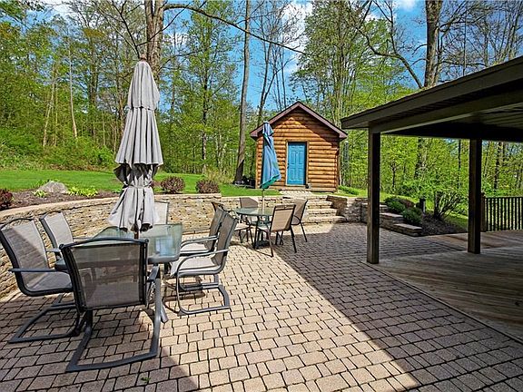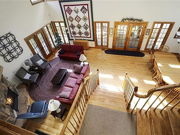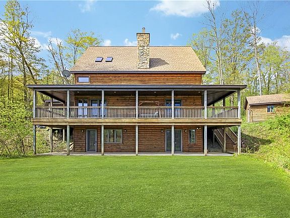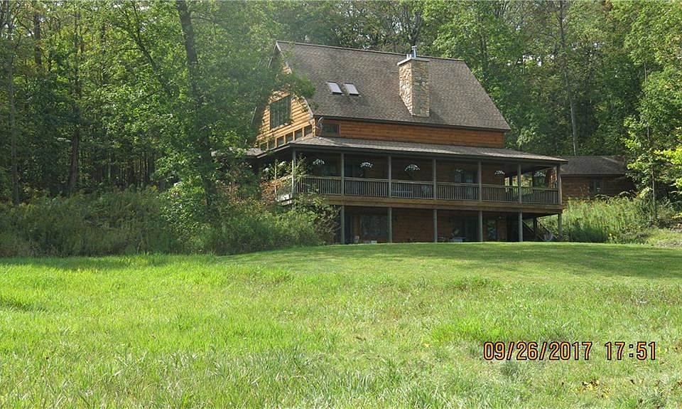 Enjoy a lovely view of fields and woodlands from this country home with covered wrap porches plus many patio areas. The main living area with a 29-foot cathedral ceiling is dramatic and the many windows make the area light and bright. The main floor consists of a large great room with a gas fireplace and opens to the kitchen, a master suite with doors opening on to the covered porch. Two walk-in closets and a bath with two sinks, a large walk-in shower, a jacuzzi tub, and a commode closet make the master area very comfortable. To complete the first floor, there is another full bath and a laundry area. A grand staircase leads to the upper floor bedrooms consisting of 4 bedrooms and two full baths. There is an additional staircase to give the choice of how to access two of the bedrooms. Add to this a lower level walkout with a large family room with wood-burning fireplace and another half bath. On this level there is also a good-sized workroom that also houses some of the utilities. This large home has two furnaces with A/C. Country setting with lovely views located close to Chautauqua Institution. In recent years this property has been used as a successful Air B & B.