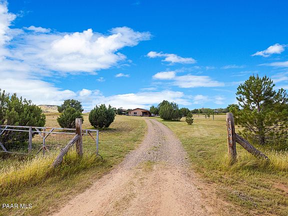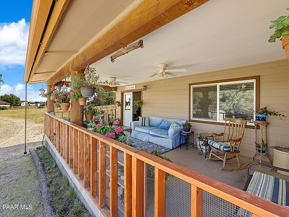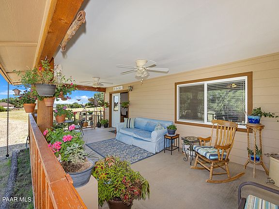Outstanding opportunity for the right buyer- this property is the perfect seasonal getaway or could add additional living space! Massive six car garage and plenty of room to add a primary home or even zoning allows for a manufactured home and turn the existing ~700 sqft into a guest casita! Fully fenced three acres abounding with mature trees, small pond, and fantastic panoramic views of the Mingus Mountain range and San Francisco Peaks which can be enjoyed from the beautiful front porch! Interior of the home has a living room with dining area and convenient dog door that leads out to an enclosed dog run. The efficiency kitchen is equipped with a double vessel sink, four burner gas range, and spacious attached pantry CONTINUE