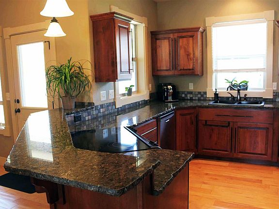 STUNNING FINISHES FROM TOP TO BOTTOM! Come see this open and inviting floor plan that boasts vaulted ceilings, beautiful hardwood floors across much of the main floor, granite countertops and stainless steel appliances in the kitchen, and a jumbo 2 door/3 car width garage that provides tons of storage space. The newly vinyl fenced yard and concrete patio provide a great setting in the backyard for kids, visitors, and pets. High quality finishwork is featured throughout the home including cased windows, custom cabinets, and 6" base trim. The gas fireplace and R60 insulation in the attic add warmth to the home while the central air conditioning is perfect for cooling during summer. The finished basement hosts two bedrooms, bathroom, family room with office area, and spacious storage room. Not your cookie cutter house!